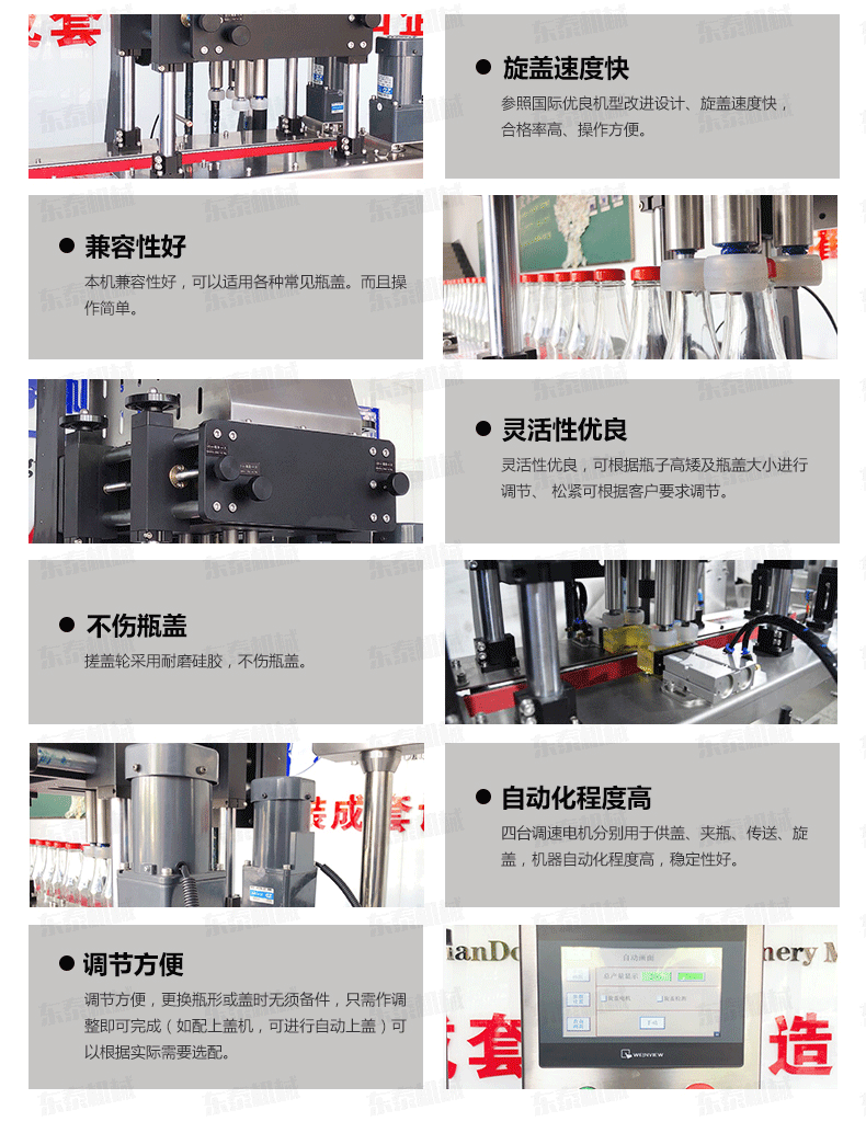 全自動旋蓋機是參照國機型改進設計、旋蓋速度快,合格率高、操作方便。可適用于食品、制藥、日化、農藥、化妝品等行業的不同瓶形的旋蓋。四臺調速電機分別用于供蓋、夾瓶、傳送、旋蓋,機器自動化程度高,穩定性好,調節方便,更換瓶形或蓋時無須備件,只需作調整即可完成(如配上蓋機,可進行自動上蓋)可以根據實際需要選配。