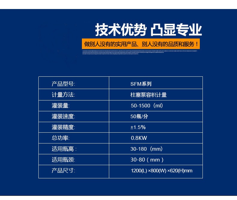 產(chǎn)品簡介:半自動(dòng)醬類醬料灌裝機(jī)SFM系列結(jié)構(gòu)合理、機(jī)型小巧、性能可靠、定量準(zhǔn)確、操作方便。整機(jī)304不銹鋼,灌裝悶頭防漏料防滴油,氣缸驅(qū)動(dòng)結(jié)構(gòu),加大200L料斗,品牌全鋁殼銅芯大功率攪拌電機(jī),變頻調(diào)速,PLC智能控制,用戶可根據(jù)需要任意調(diào)節(jié)灌裝量及灌裝速度,灌裝精度高。