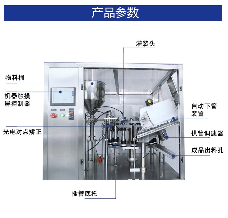 A、RGNF-30適用于醫藥、食品、化妝品、日用化工用品等行業的塑管、鋁塑復合管灌裝封尾需要?蓪⒏鞣N 糊狀、膏狀、粘度流體等物料順利準確地注入軟管中,并完成管內熱風加熱、封尾和打批號、生產日期等。