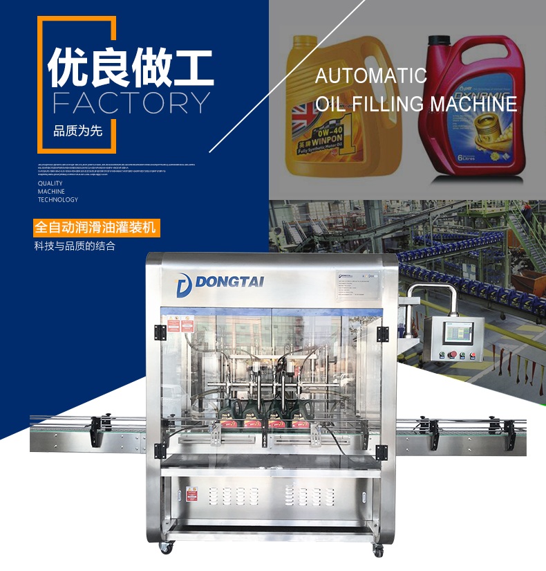 該潤滑油灌裝機集機械、電子、氣動為一體。該生產線由理瓶機、直線式灌裝機、旋蓋機、貼標機、噴碼機等組成。具有自動化程度高、成品率高、適用性廣、穩定性好而受到廣大用戶青睞。該生產線能自動完成理瓶、灌裝、旋蓋、貼標、噴碼等功能。裝量精度高、使用使用壽命長、耐高溫、耐酸堿,填補了內空白。適用于油類半流體等不同粘度物料的灌裝,充分體現了本公司在產品設計、制造上的優勢。灌裝系統采用PLC微電腦、人機界面組合控制、操作簡單、維護方便。所有接觸物料部分的材料和裝潢材料全部采用優質不銹鋼制造,表面進行了拋光處理,外形美觀、大方,不污染環境,符合GMP要求。