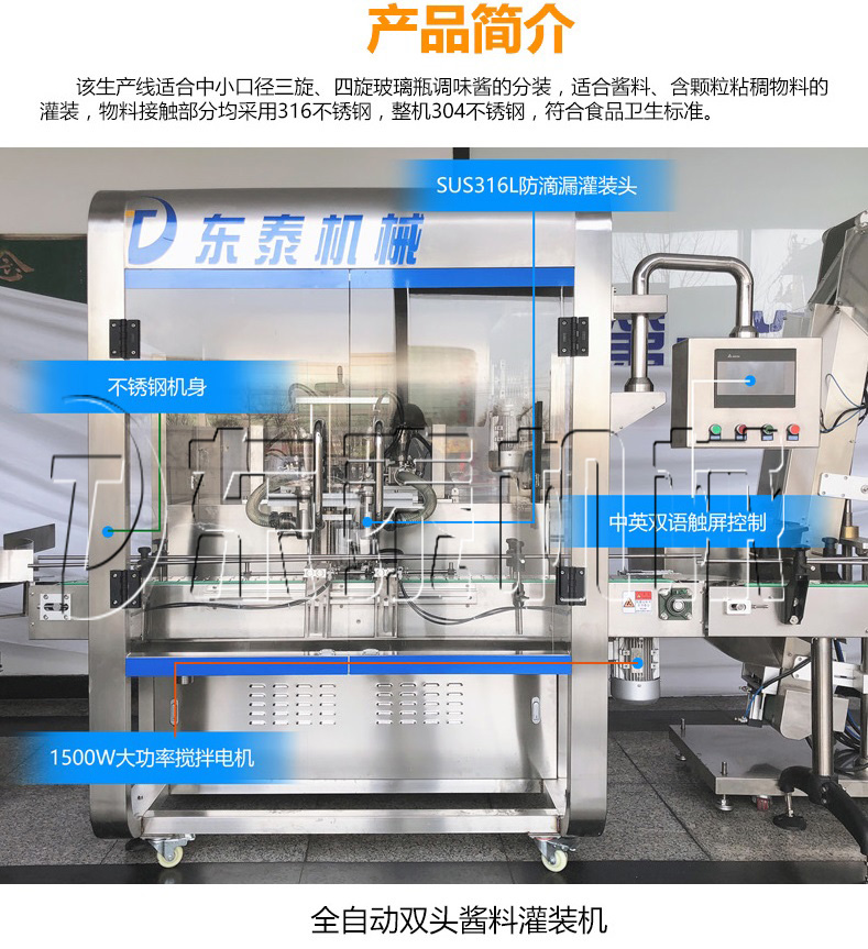 該機為全自動醬類灌裝機,配有自動攪拌功能,使物料混合更加均勻 ,有效的解決灌裝誤差大的問題;本機輔料添加料可調,精準方便,提高自動化程度。 醬類灌裝機氣動部分均采用氣動元件,壽命長,穩定。 物料接觸部分采用SUS316L不銹鋼材料制成,符合食品醫藥安全衛生要求。 灌裝閥由氣動閥控制,灌裝精度更高。 灌裝量和灌裝速度均可任意調節。 灌裝頭是我公司創新的灌嘴,可有效解決拉絲、滴漏問題. 該醬類灌裝機大小瓶調節方便,配置自動升降裝置。 采用集成理念設計,易損件少,方便企業維護保養。 該全自動醬類灌裝機設有無瓶不灌裝功能,不需更換零件,即可快速調整各種不同形狀規格的瓶子。